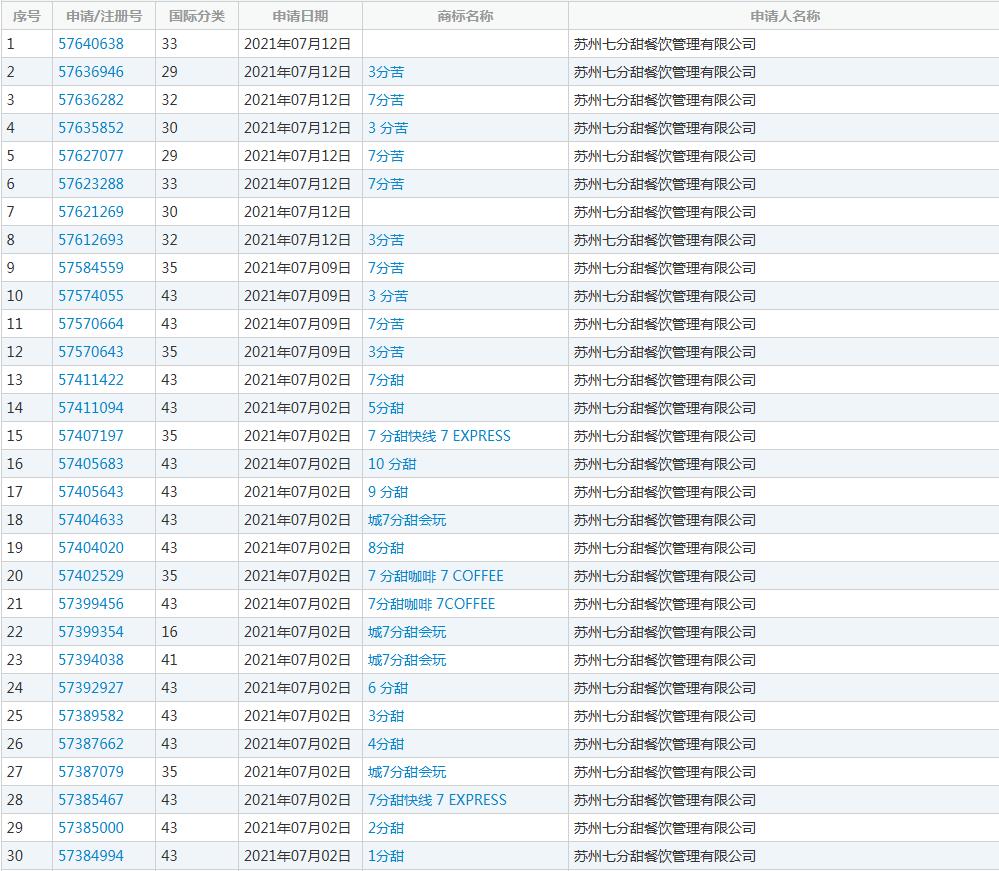 近日,笔者在中国商标网商标网上检索系统查询显示,7分甜关联公司苏州七分甜餐饮管理有限公司申请注册“1分甜”“2分甜”……“10分甜”商标,国际分类均为餐饮住宿,商标状态均为注册申请中。